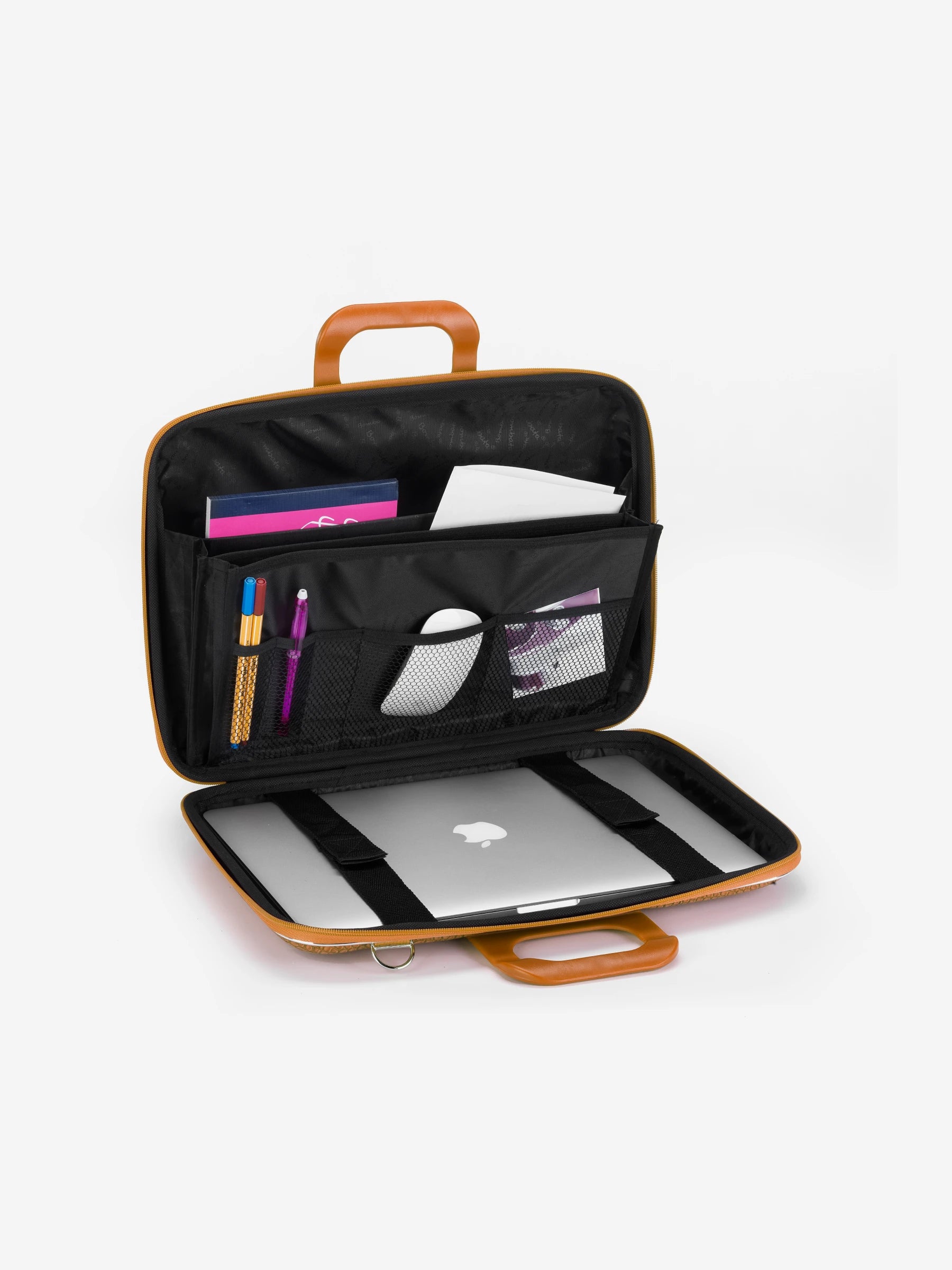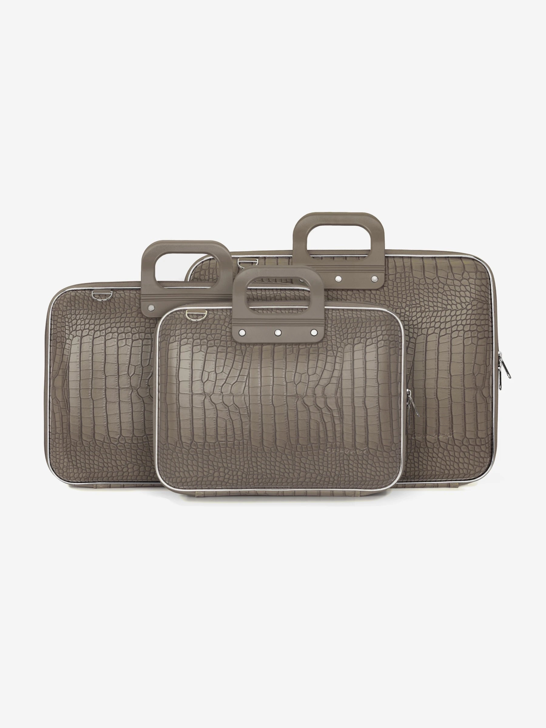 A laptop bag featuring a crocodile-textured exterior. Its numerous pockets can accommodate 13" to 17" laptops, along with accessories and documents.
